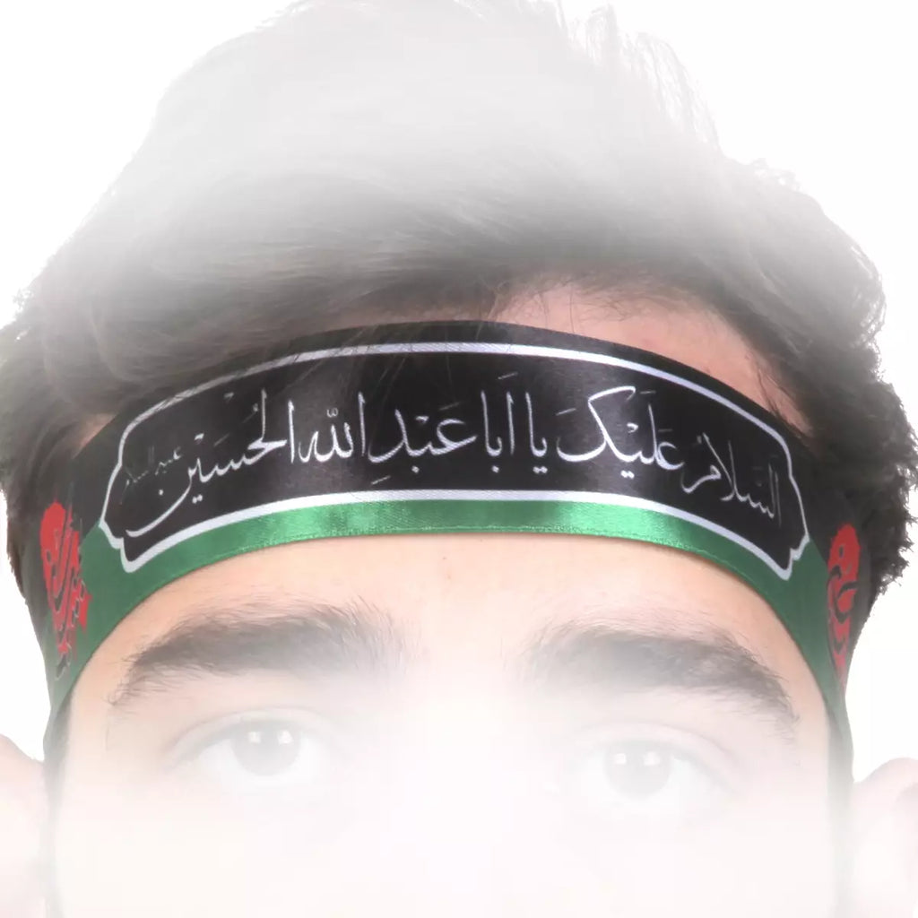 Embrace faith and reverence with our headband featuring "Asalamu alayka ya Aba Abdillahil Hussain (as)" (Peace be upon you, O Father of Abdillah, Hussain).