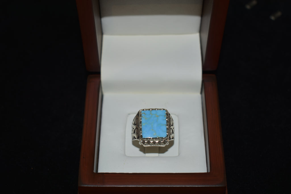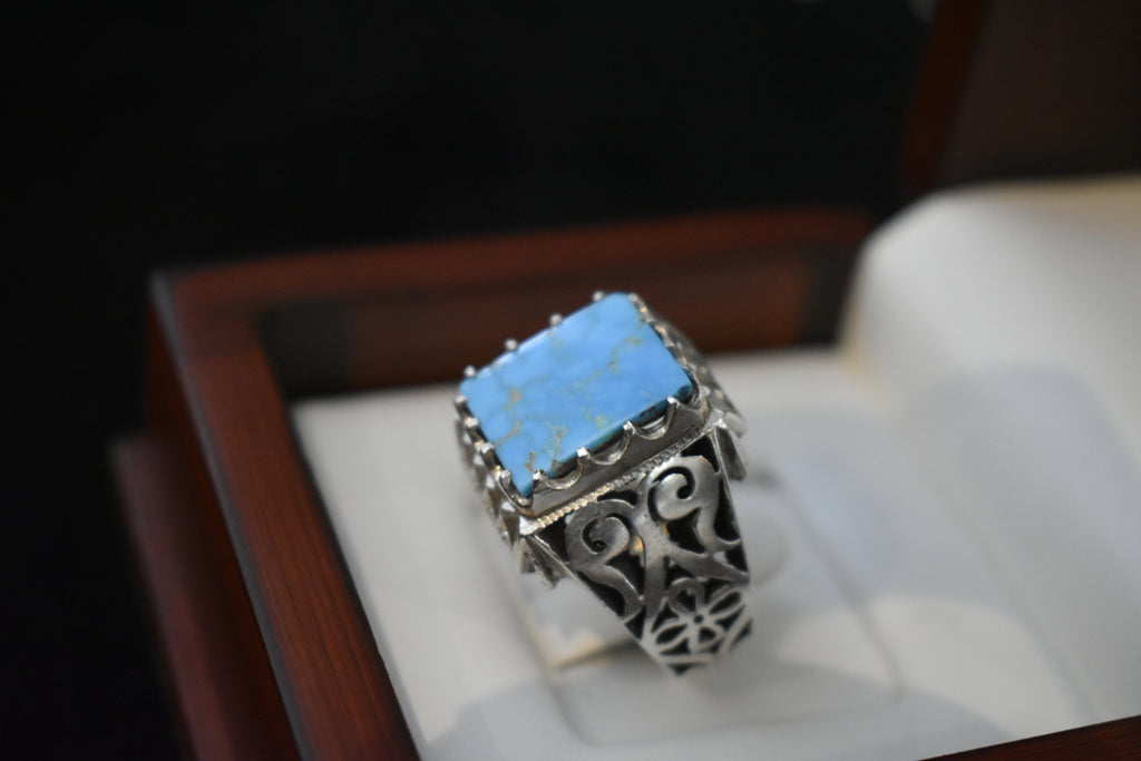 Elevate your style with the Pure Feyrouz Neyshapouri Ring, featuring a stunning square-cut Neyshapouri turquoise (Feyrouz) stone, renowned for its captivating blue tones and natural marbling. The bold, geometric shape of the stone is paired with a sleek, handcrafted band made from pure 925 sterling silver, ensuring durability and timeless elegance.